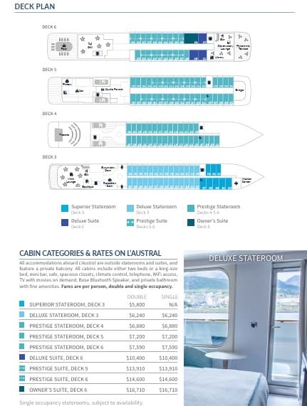 First introduced in 2011, L’Austral is the very embodiment of PONANT EXPLORATIONS’ generation of intimately sized ships. The exterior and interior lines, all understatement and refinement, make this a yacht of a rare and innovative kind. The wellness area offers a spa with massage and beauty treatments, as well as a fitness area and steam room. Plus, with just 132 staterooms and suites, each with a sea view, guests will enjoy the subtle combination of luxury, intimacy, and well-being.