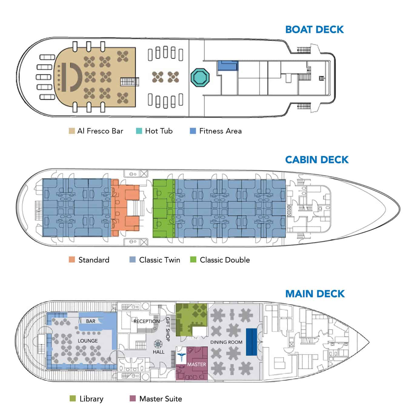 Returning to the ship embrace valuable leisure time to rejuvenate between adventures. Relax on the spacious sun deck while admiring the panoramic landscape, take a dip in the hot tub or re-energize with a workout in the fitness room.